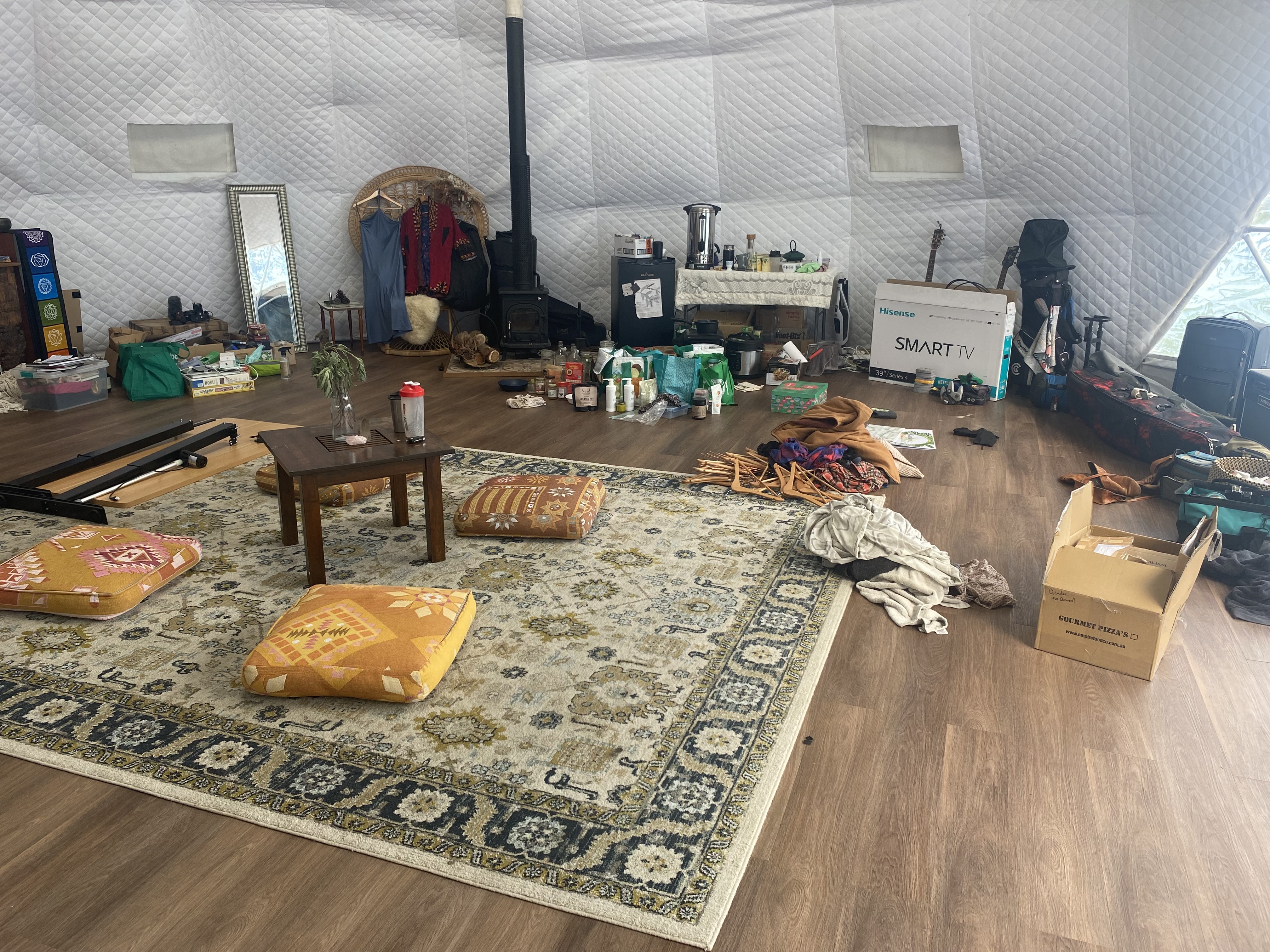 Bags and boxes tightly packed resemble a fist tightly clenched; unyielding, unwilling to let go or surrender. Through moving into a geodesic dome on 18 acres in the Sunshine Coast hinterland, I am actively practising sitting in the mess, not-knowing and not-controlling, surrounded by vessels and things half-unpacked, fists relaxed and fingers splayed open...